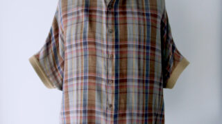 そんな事はさておき生地の他の特徴を。生地は兵庫県の地場産業の播州織を使用しておりますが、少し変わった生地でとてもハリ感が強いです。触るとシャカシャカと音が鳴るほどで、綿100ですか?とよく尋ねられほどです。打ち込みが良いと表現されるのですが、非常に高密度で織られている播州織になります。表情は面白いのですが、縫製面ではとても難易度が高い生地になります。