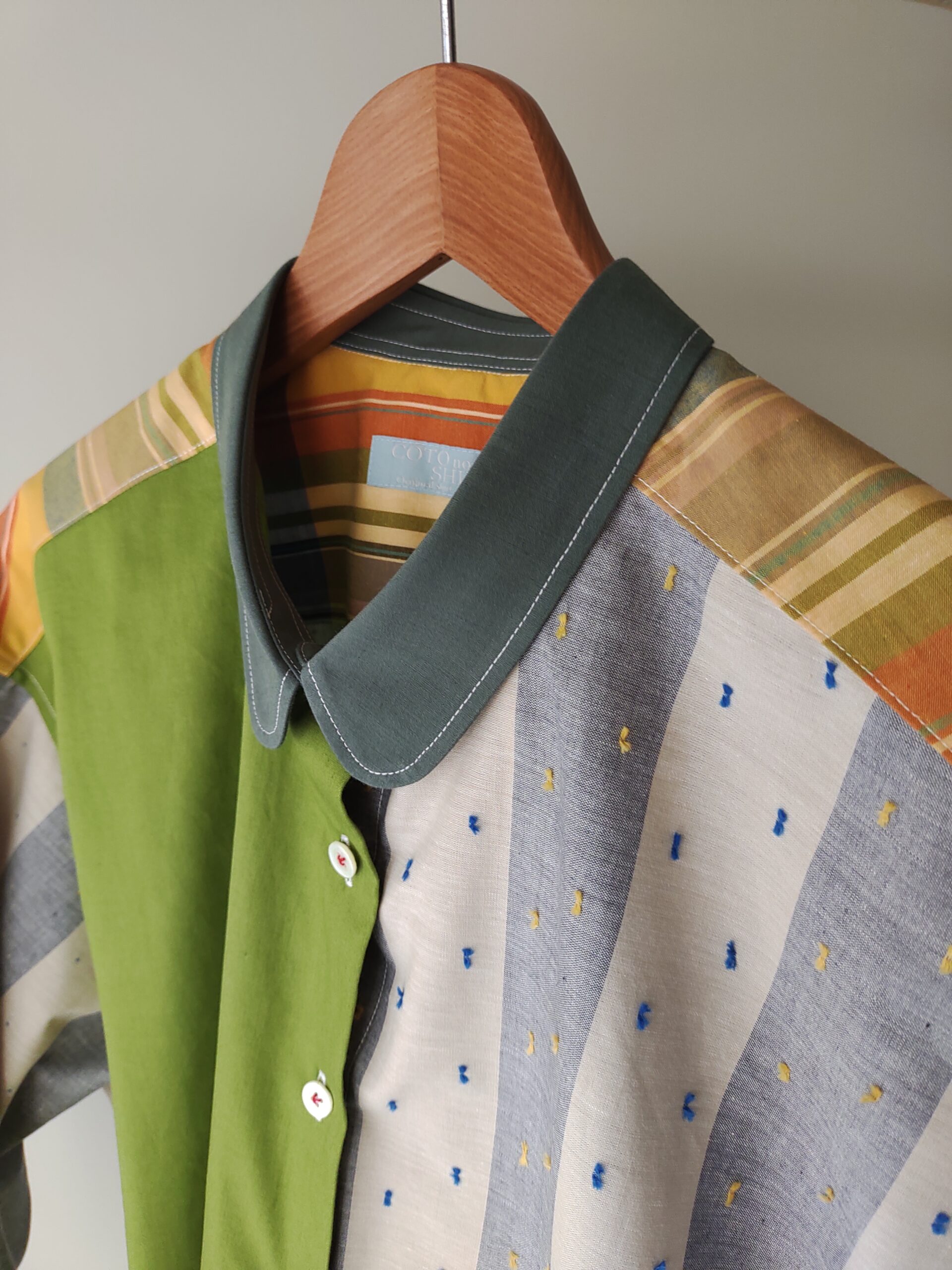 前回のパッチワークはパーツ内で生地を切り替えたデザインでしたが、今回のシャツはパーツ毎に切り替えたシャツになります。ほぼ全てのパーツで使う生地を切り替えているのですが、それぞれの生地も多色使いの生地が多く含まれています。そのためとてもカラフルでかつ個性あふれる一枚となっていますよねー。