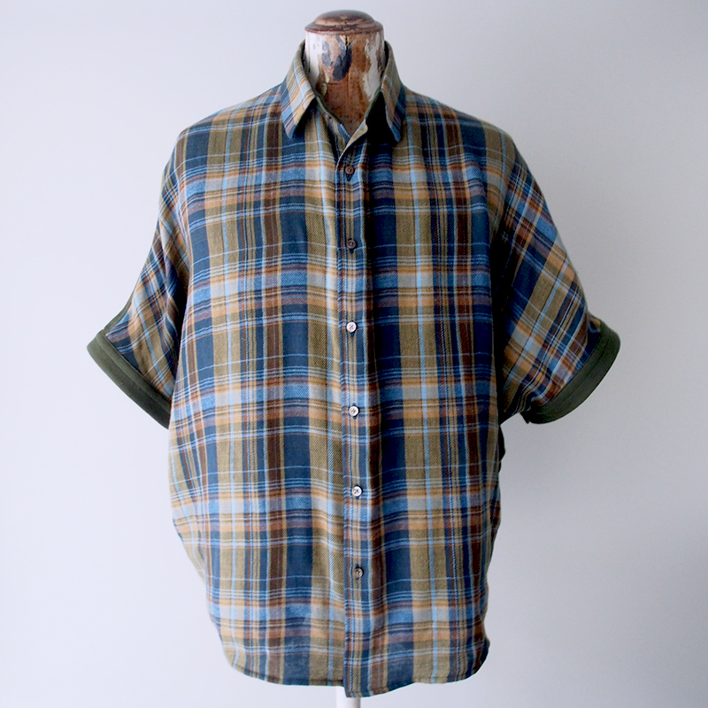 そんな事はさておき、今日も新作の紹介です。先週ご紹介したダブルガーゼ生地の色違いバージョンです。無地面がカーキ色になっており比較的落ち着いたトーンのため、このシャツは後身頃全面を無地で使用しています。このムササビシャツは、身頃と袖が一体となったデザインになりますので、パーツが少ないんです。そのためテキスタイルの特徴がデザインに大きな影響を及ぼします。そのため先週のベージュ系の生地だと無地面を多く使用するとバランスが悪いと判断したため、前後身頃をチェックで使用しました。でも今回のシャツは前後一緒だと、生地の良さ・形の良さが削がれると判断したため、写真では分からないのですが後身頃は無地面を使用しています。逆に衿はチェックを使用し、後ろから見た時にも両面が見えるようにしています。同じ企画の播州織でも同じデザインにするのではなく、生地それぞれのポテンシャルを活かすのもとても大事だと考えているんです〜。