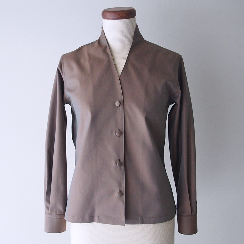 こんな理由があり神戸コトノイロシャツではフラット丈のシャツをあまりお作りしていないのですが、今回はデザインを優先して作ってみました。使っている播州織は、緑とオレンジ色の糸を使用した若干厚めのツイル生地。撥水加工も施されています。今回のように経糸と横糸に大きな違いがあれば玉虫色が生まれるんです。見る角度により表情が異なり光沢を感じる魅力的な生地ですよね。上品さもプラスされるので、今回のジャケット風のデザインと相性抜群だと思っています。