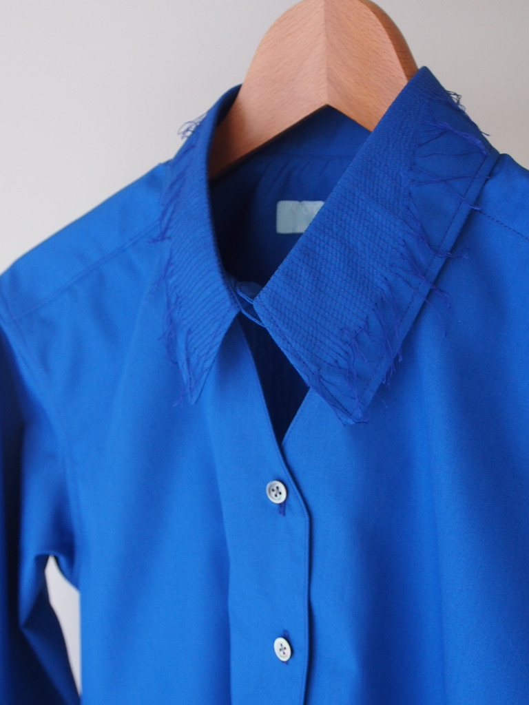 そしてこのシャツの大きな特徴はもう一点。デコルテ部分です。写真ではわかりにくいですが言葉で説明すると、「Vネックシャツに、付け衿がついたシャツ」なんです。台衿部分は前身頃部分全てと縫製しているわけではなく、前身頃の1/3ほどとのみ縫製している状態にしています(2/3ほどは台衿単独の状態)。そして前身頃はVネック状となっていますので、台衿のボタンを閉めると肌が見える状態になるんです。女性の方ですので、ネックレスなどを合わせるとよりエレガントに見えそうですね〜。その他にも今までお作りさせていただいた専用型紙を随所に組み合わせて使用しているんです。まさに世界に一枚のシャツという感じがします。そしてこの方の感性が大好きなんです。